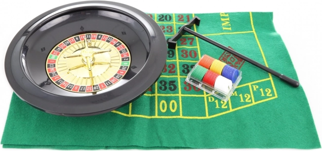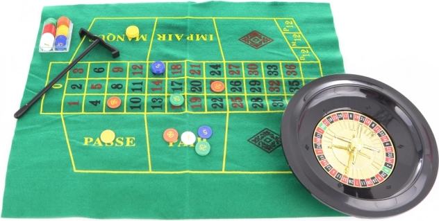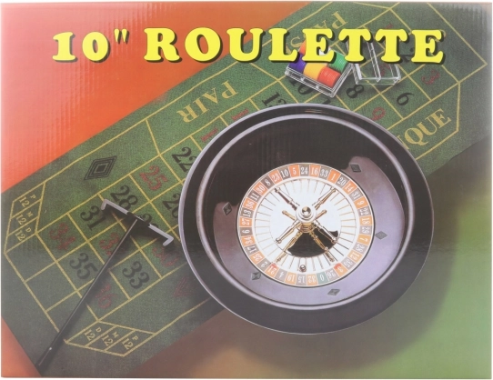 Joc de societate Ruletă. Pachetul conține o ruletă cu diametrul de aproximativ 25,5 cm, pânză, greblă, 2 bile metalice, 60 de jetoane colorate și regulile jocului. Dimensiunile ambalajului sunt de aproximativ 42,5 x 33 x 6 cm. Vârsta 3+