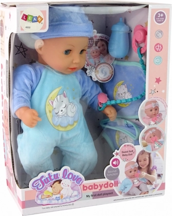 Păpușa bebelușă adorabilă este îmbrăcată în pijamale frumoase albastre cu model de pisică adormită și poartă o căciuliță pe cap. Setul include și o suzetă roz și un biberon. Accesoriile includ de asemenea o bavetă și chiloței. Aspectul general este armonios și foarte atrăgător.