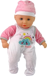 Păpușa este îmbrăcată într-o pijama roz-alb cu un nor zâmbitor și o căciuliță asortată, oferind jucăriei un aspect atractiv și dulce.