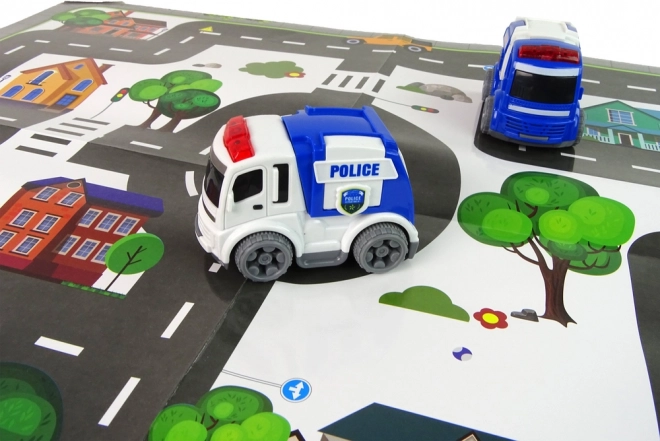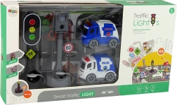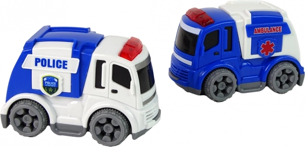 Set de jucării cu tematică rutieră ideal pentru copiii care învață regulile de bază ale traficului rutier. Conține o mașină de poliție și o ambulanță, ambele ușor de ținut de mâinile mici ale copiilor.