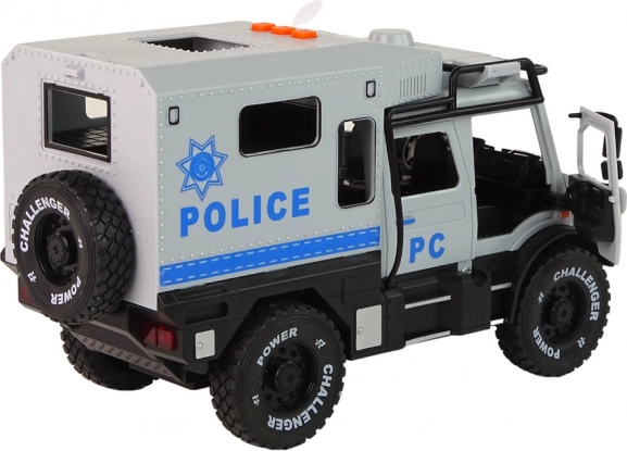 Datorită ușilor din față rabatabile, copiii pot explora interiorul mașinii și își pot crea propriile scenarii. Efectele sonore și de iluminare adaugă un plus de entuziasm! Luminile LED din partea frontală a vehiculului se aprind la apăsarea unuia dintre cele trei butoane de pe acoperiș, iar sunetele de alarmă adaugă un aspect realist.