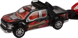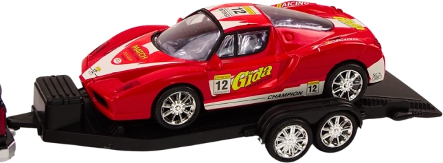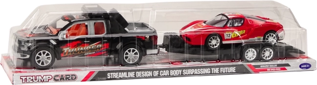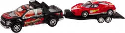 Pickup-ul cu roți mari negre tractează fiabil remorca cu mașina sport, iar datorită acționării inerțiale pornește înainte fără baterii după câteva împingeri. Remorca detașabilă permite schimbarea rapidă a jocului – copiii pot transporta vehiculul sau se pot juca cu fiecare model separat. Mașina sport roșie impresionează prin linii elegante și poate fi ușor încărcată și descărcată.
