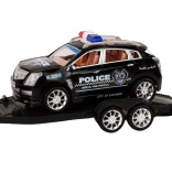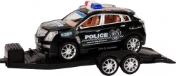 Pe remorcă se află un vehicul de teren de poliție negru, care are de asemenea inscripția „POLICE” pe caroserie. Această mașină este proiectată să arate robust și gata de acțiune, fiind ideală pentru jocuri cu diverse scenarii polițienești.