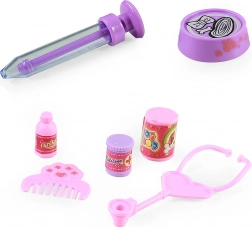 Setul include diverse unelte, cum ar fi injecții, pieptene, stetoscop și altele, toate în culori diverse. Perfect pentru simularea îngrijirii animalelor.