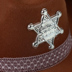 Transformați micul cowboy în șerif într-o clipă. Pălăria maro, cu panglică stilată și stea de șerif lucioasă, stă bine datorită elasticului, astfel încât se potrivește grozav chiar și în timpul jocului plin de acțiune.