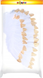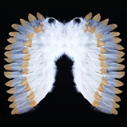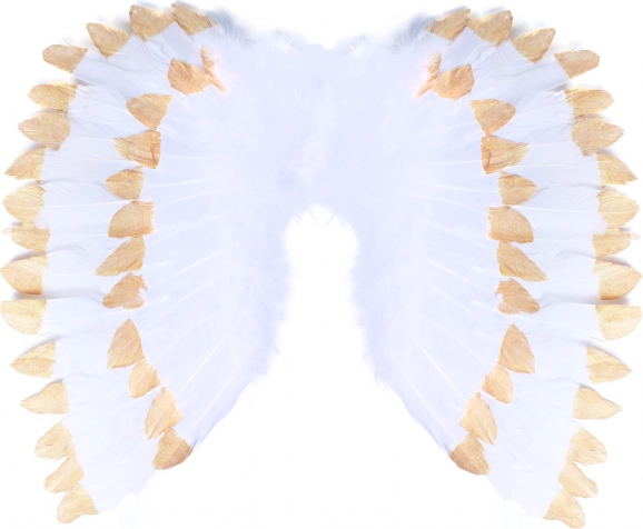 Aripi de înger elegante, cu pene alb imaculat și sclipici auriu, completează perfect costumul de înger. Datorită dimensiunilor de aproximativ 67 × 46 cm, oferă un efect vizual puternic și o purtare confortabilă la carnaval, de Moș Nicolae și la petreceri tematice.