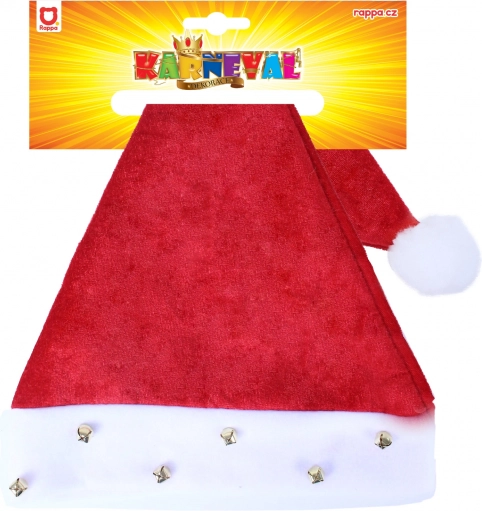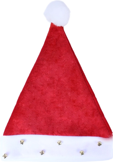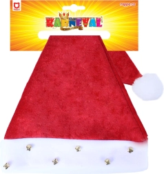 Căciulă de Crăciun stilată cu margini albe, decorată cu clopoței și pompon. Ideală pentru petrecerile de Crăciun.