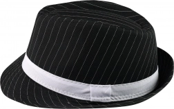 Dungi albe fine pe fundal negru oferă pălăriei un stil atemporal, ușor de asortat atât cu costume, cât și cu ținute smart casual.