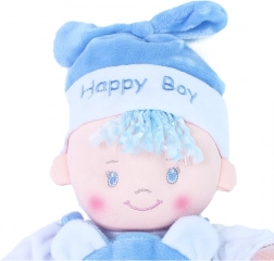 Păpușă de cârpă adorabilă, în hăinuțe albastre și cu căciuliță, ideală pentru îmbrățișat și pentru primele jocuri. Material textil moale, chip brodat și dimensiune compactă de 25 cm o fac partenerul perfect pentru copii, atât acasă, cât și în călătorii.