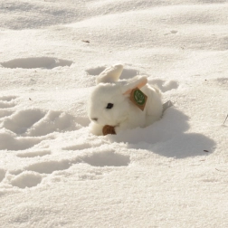 Iepuraș de pluș de culoare albă, cu dimensiunea de 18 cm, cusut manual din pluș fin de calitate, ceea ce îi conferă un aspect realist. Ideal pentru iubitorii de jucării de pluș pufoase.