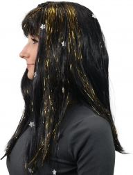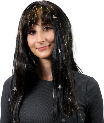 Peruca adaugă dungi aurii și stele argintii clasicului păr negru, făcând-o un accesoriu grozav pentru orice eveniment tematic.