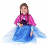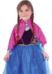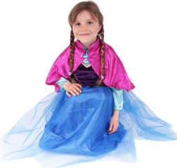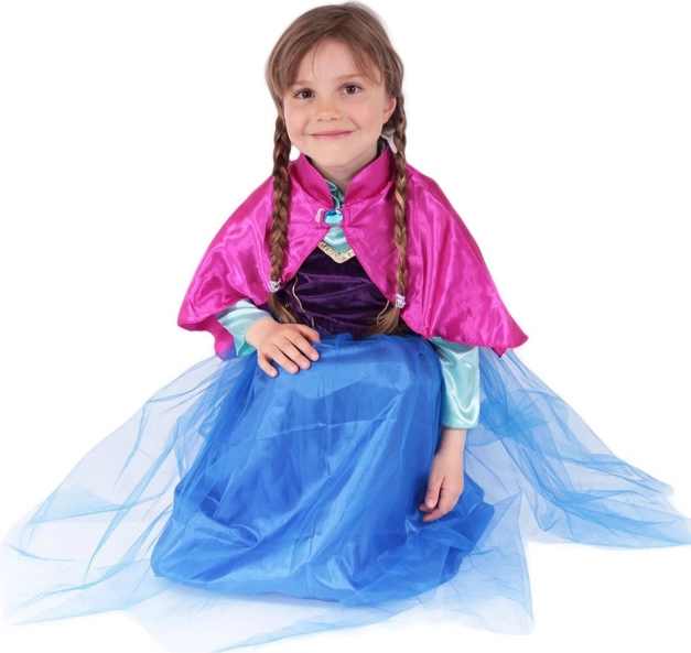 Acest costum stilat transformă orice fetiță într-o prințesă curajoasă, pregătită pentru aventuri de iarnă. Culorile bogate negru–albastru, cu detalii aurii, și pelerina roz din satin cu broșă decorativă creează un aspect impresionant pentru carnaval, petreceri aniversare și joaca de acasă.