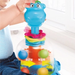 Acest carusel mecanic multicolor în formă de dinozaur transformă orice joacă într-o experiență plină de bucurie. Este suficient să apeși capul și să urmărești cum biluțele se învârt, sar și zornăie – ideal pentru dezvoltarea coordonării ochi–mână și a înțelegerii cauzei și efectului.