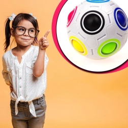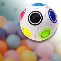 Mingea puzzle Rainbow Ball este o jucărie inteligentă și captivantă, bazată pe principiul puzzle-urilor cu piese glisante. Sarcina ta este să muți bilele între orificii și să le potrivești după culorile inelelor. Un orificiu fără inel colorat rămâne gol și servește drept spațiu temporar pentru mutare.