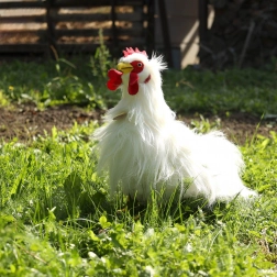 Găina de pluș este cusută manual și realizată astfel încât să semene cât mai mult cu o găină reală.