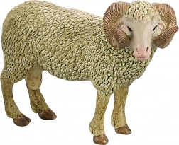 Figurina berbecului din acest set are structura lânei realizată realist și coarne curbate, ideale pentru scopuri educative sau colecții.
