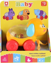Animăluţul vesel sub forma unui căţel pe roţi îi motivează pe copii la mers şi explorare activă. De îndată ce jucăria se mişcă, biluţele colorate din interior încep să ţopăie şi să scoată sunete line, care îi captivează pe cei mici şi le susţin atenţia.