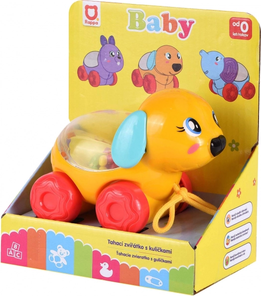 Drăgălaşul căţel de tras pe roţi aduce copiilor multă distracţie şi mişcare. La tractare sau deplasare, în interiorul tobei transparente sar biluţe colorate, care stimulează percepţia vizuală şi motricitatea. Jucăria ideală pentru primii paşi şi joaca activă.