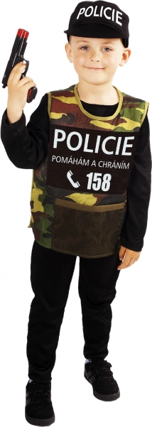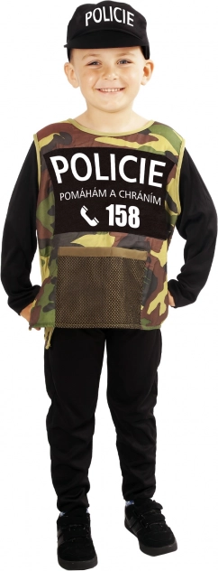Transformați-vă copilul într-un adevărat erou cu costumul de polițist, care include un salopetă neagră, o vestă camuflaj cu inscripția POLIȚIE și o șapcă. Ideal pentru copiii între 4 și 6 ani.