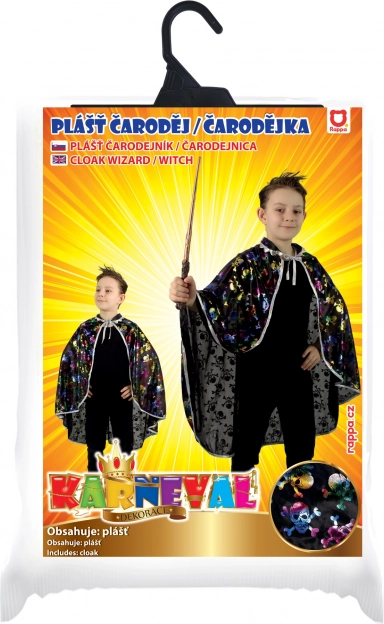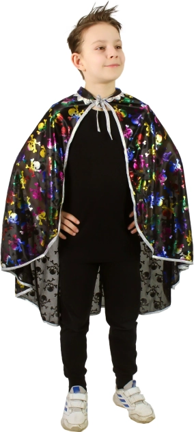 Transformați copilul într-o clipă în vrăjitor sau vrăjitoare cu o pelerină ușoară și confortabilă, care se leagă simplu la gât. Datorită gulerului și imprimeului metalic cu cranii bine evidențiat, costumul arată spectaculos în orice fotografie și pe ringul de dans.