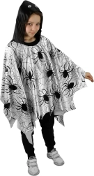 Căutați un costum ușor și de efect pentru copii? Această pelerină/poncho ușoară, cu imprimeu negru cu păianjeni și pânze de păianjen pe fundal alb, atrage atenția din primul moment. Datorită croielii lejere, se îmbracă ușor peste cap și permite libertate deplină de mișcare la joacă, dans și parade.