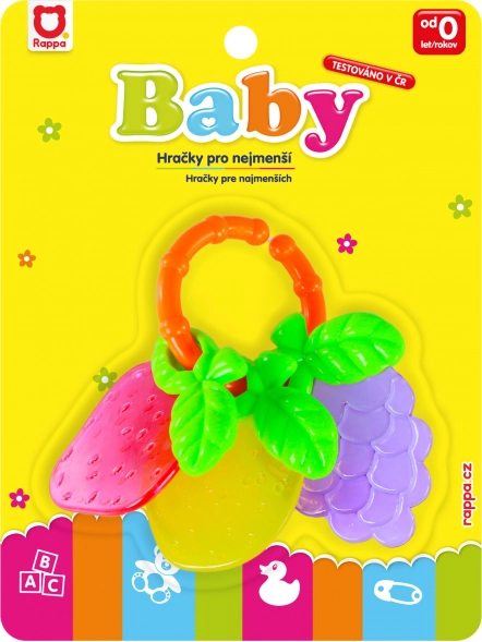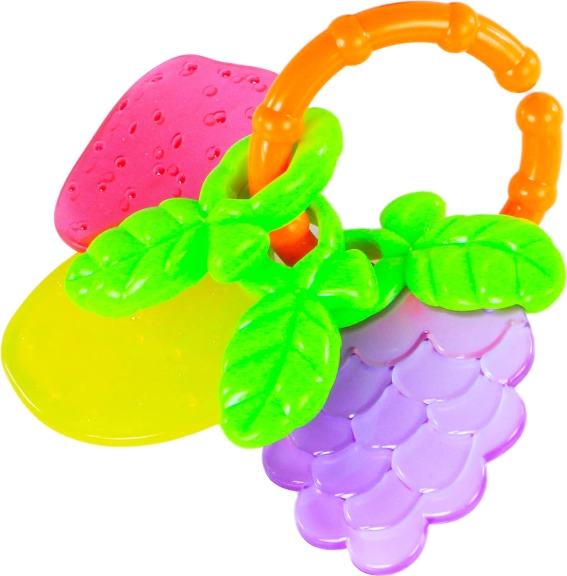Jucăria zornăitoare/inerul de dentiție cu motive fructate îi atrage pe cei mici prin culorile vii și textura plăcută, care masează gingiile și ajută în timpul erupției dinților. Forma practică susține prinderea naturală și dezvoltarea motricității fine.