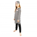 Costum stilat cu dungi pentru deținută, pentru fete cu vârsta 6–8 ani (117–128 cm), ideal pentru carnaval, bal mascat și serbări școlare. Include tricou lung cu dungi și șapcă cu numărul 9999. Ambalajul EKO economisește spațiu și protejează natura, fiind ideal pentru cumpărături online.