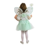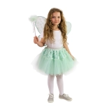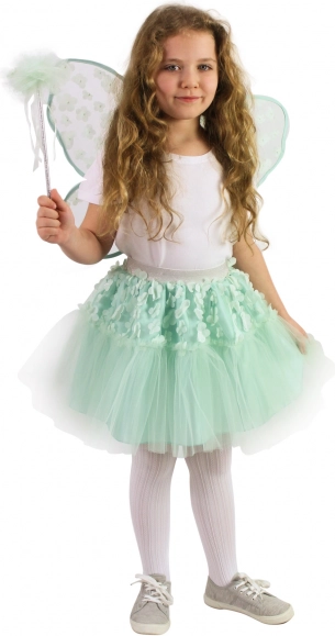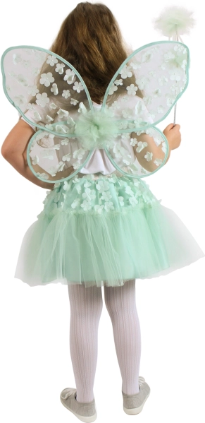 Transformați fiecare fetiță într-o zână fermecătoare cu acest costum minunat. Fustița din tul verde cu jupă de satin este decorată cu floricele mici și are elastic argintiu în talie pentru un confort sporit. Aripile și bagheta sunt perfect asortate cu tema generală.