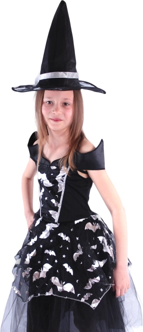 Acest costum de vrăjitoare cu motive de liliac este alegerea perfectă pentru fetițele cu vârste între 6-8 ani și cu înălțimea de 117-128 cm. Rochia neagră cu fustă pufoasă este împodobită cu elemente argintii, iar pălăria asortată cu panglica elegantă argintie completează perfect aspectul.