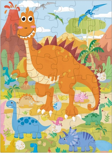Puzzle distractiv și educativ cu tematică de dinozauri pentru micii exploratori. Conține 48 de piese mari pentru prindere și asamblare ușoară. Imaginea finală are dimensiunile 60 × 44 cm și sprijină dezvoltarea motricității fine, gândirii logice și creativității la copiii de la 3 ani.