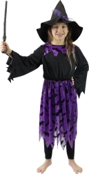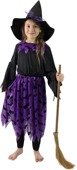Combinația vizibilă negru‑mov și decorul cu lilieci conferă costumului o atmosferă autentică de vrăjitoare, care atrage privirea din prima clipă.