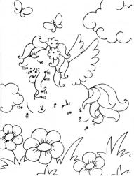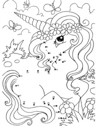 Conectarea punctelor cu unicornul și fluturașii susține recunoașterea numerelor și răbdarea – ideal pentru începători.