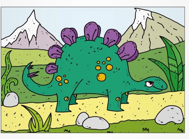 Caietul în format A5 oferă 16 pagini și 8 șabloane de colorat (de ex. stegozaur, tyrannosaurus rex, brontozaur, pterodactil etc.). Ilustrațiile realizate de Barbora Křístková sunt clare și jucăușe, potrivindu-se atât pentru activități comune, cât și pentru distracție individuală.
