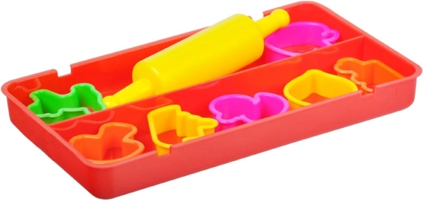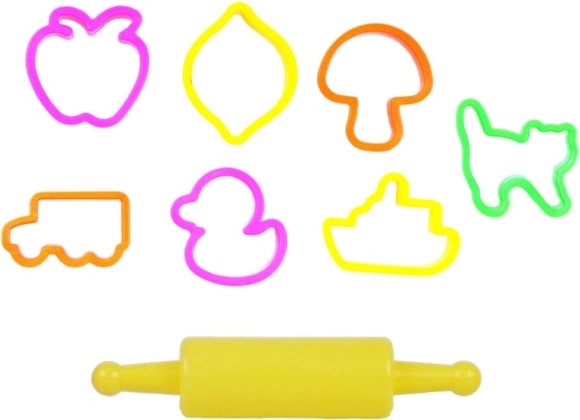 Setul include forme colorate din plastic, de diferite forme, și un sucitor galben ușor, cu care copiii întind și decupează cu ușurință modele perfecte.