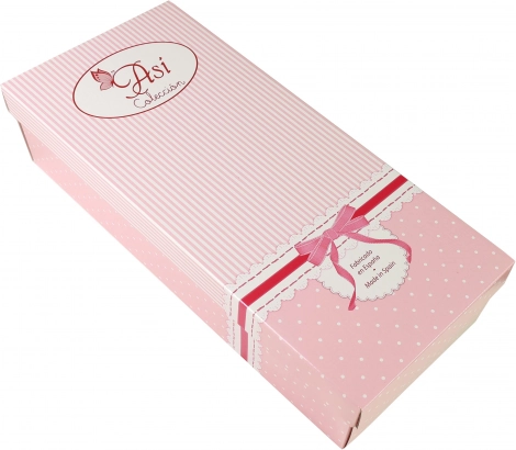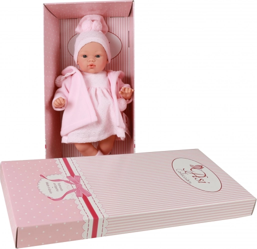 Păpușa este îmbrăcată într-un set roz stilat: rochiță tricotată, hăinuță călduroasă cu închidere cu ciucurași, căciuliță tricotată și șosete moi. Este ambalată într-o cutie elegantă de cadou, fiind ideală ca cadou pentru copii de la 3 ani.