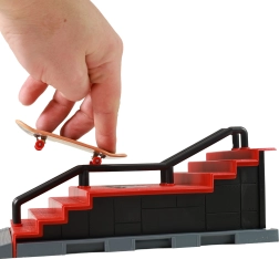 Creează-ți propria aventură de fingerboarding cu acest mini skatepark, ideal pentru antrenamentul trucurilor. Setul include o rampă cu scări și o balustradă stabilă, permițându-ți să execuți diverse trucuri, la fel ca într-un parc de skateboard real.