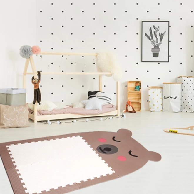 Puzzle de design pardoseală în formă de ursuleț, de culoare maro cu burtică albă, aduce distracție și confort în camera copiilor. Se potrivește perfect pentru joaca copiilor, oferind în același timp o suprafață confortabilă și moale. Întreținerea ușoară și siguranța sunt caracteristicile cheie ale acestui produs.
