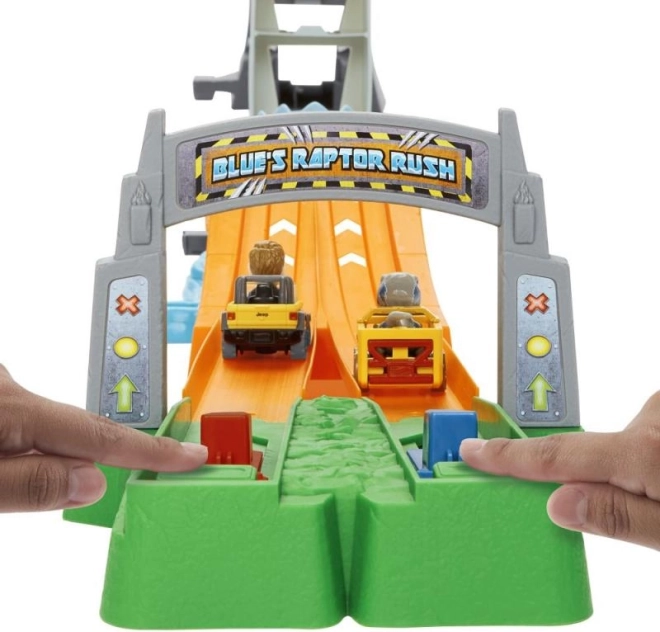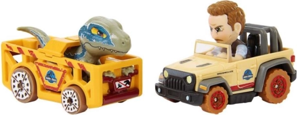 Experimentați tensiunea autentică datorită mașinilor Blue Raptor și Owen cu figurine integrate ale șoferilor.