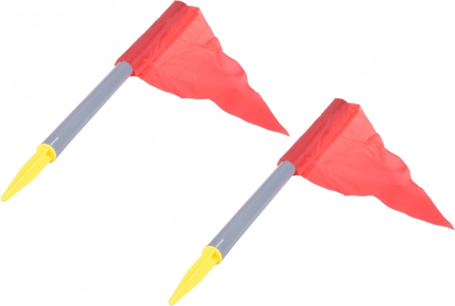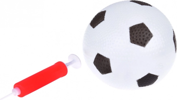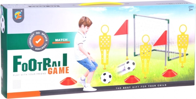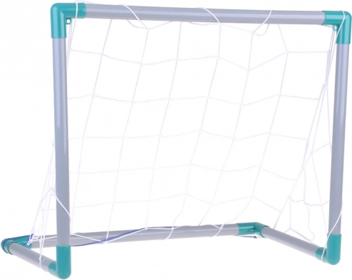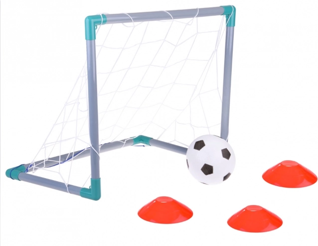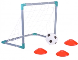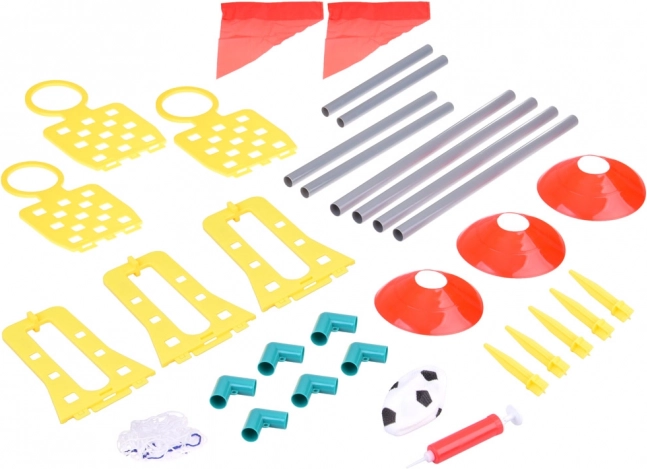Include tot ce este necesar: poartă, plasă, pompă, minge de cauciuc, stegulețe și conuri de plastic.
