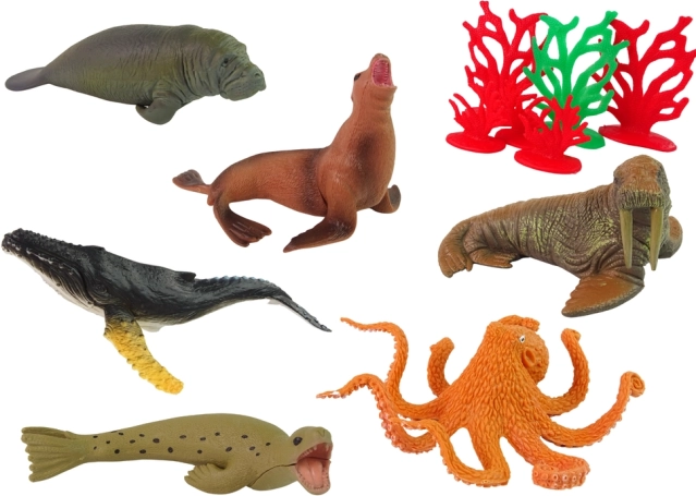 Pești și mamifere detaliate – rechini, delfin, orcă, pisică de mare, balenă, focă și caracatiță – sprijină învățarea și imaginația.