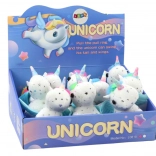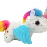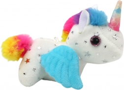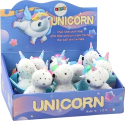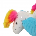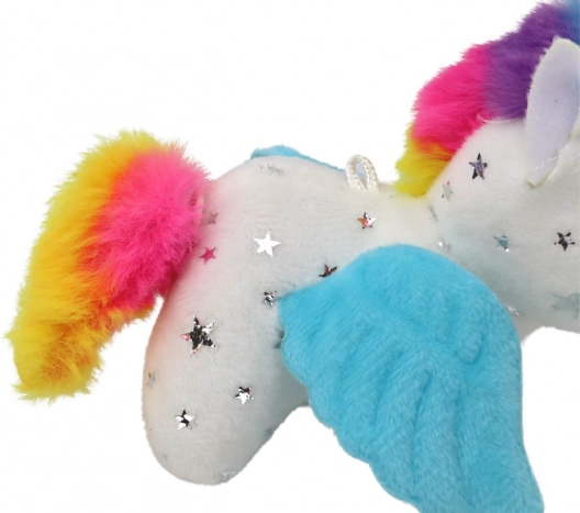 Pășiți în lumea magiei cu unicornul de pluș pe care copiii îl vor îndrăgi de la prima atingere. Blănița albă fină cu steluțe argintii, coama și coada colorate, precum și aripioarele albastre adorabile conferă jucăriei un farmec aparte. După tragerea șnurului, unicornul începe să se mişte săltăreț și să-și clatine coada, astfel încât distracția nu se termină niciodată.