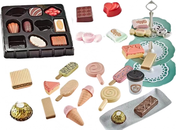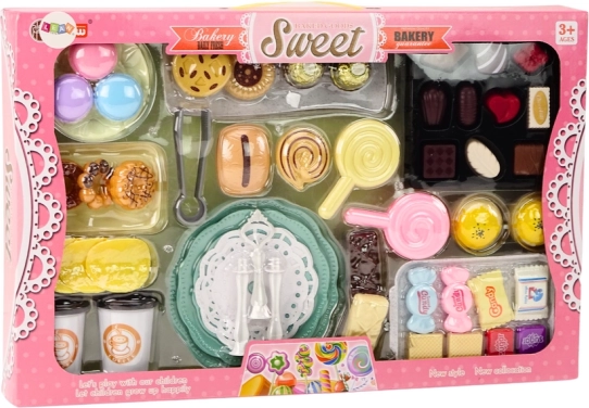 Acest set bogat pentru micii iubitori de dulciuri oferă tot ce este necesar pentru a deschide o mini cofetărie. Copiii pot servi deserturi, le pot aranja pe platoul elegant cu trei niveluri și pot „prepara” cafea pentru oaspeți. Aspectul realist al pieselor și paleta plăcută de culori susțin creativitatea, jocurile de rol și motricitatea fină.