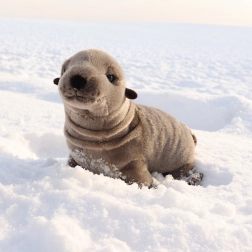 Foca de pluș are detalii realiste și culori care amintesc de o focă adevărată.