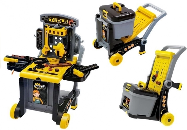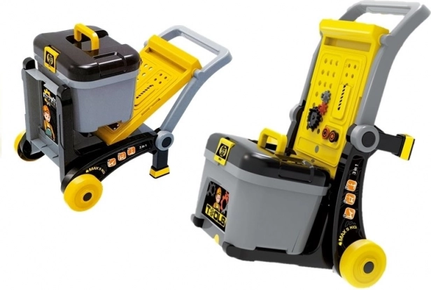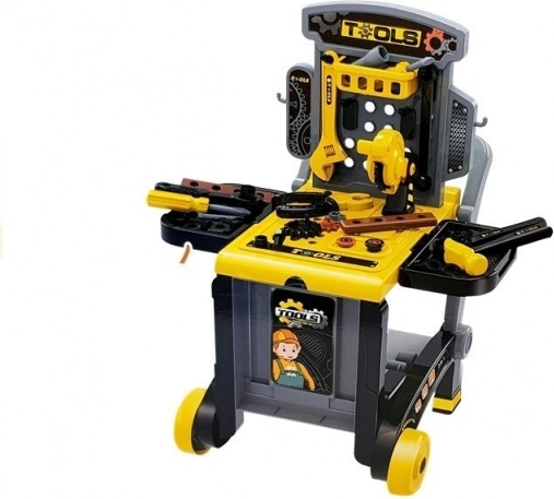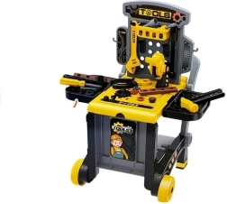 Acest set bine gândit pentru micii meșteri combină o masă de lucru cu rafturi laterale, un cărucior transformabil pentru transportul facil al sculelor și o cutie practică pentru mărunt. Este ideal pentru copii de la 3 ani și ajută la dezvoltarea îndemânării, a coordonării mână–ochi și a răbdării în timpul înșurubării, bătăii cu ciocanul și construirii.