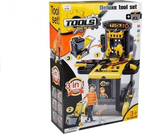 Include unelte realiste pentru copii: fierăstrău, chei, șurubelnițe, chei franceze, ciocan, clește, plăci, șuruburi, piulițe și alte accesorii. Totul este realizat din plastic de înaltă calitate pentru joc sigur și durabilitate. Setul este ambalat în cutie de cadou și, datorită certificării CE, este o alegere excelentă pentru cadou.