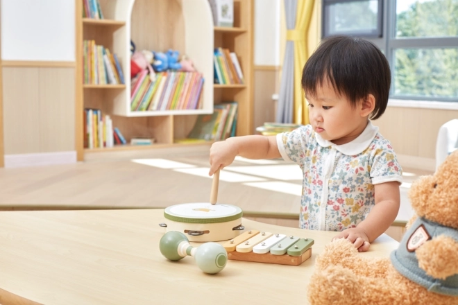 Setul include tamburină, xilofon și maracas, care permit copiilor să experimenteze diferite sunete și ritmuri.