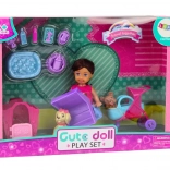 Acest set colorat include o păpușă cu păr lung șaten, în ținută roz-albastră, doi cățeluși adorabili, o căsuță roz, un cărucior și numeroase accesorii pentru îngrijirea zilnică. Datorită multitudinii de scenarii, copiii își exersează responsabilitatea și își dezvoltă abilitățile de comunicare.