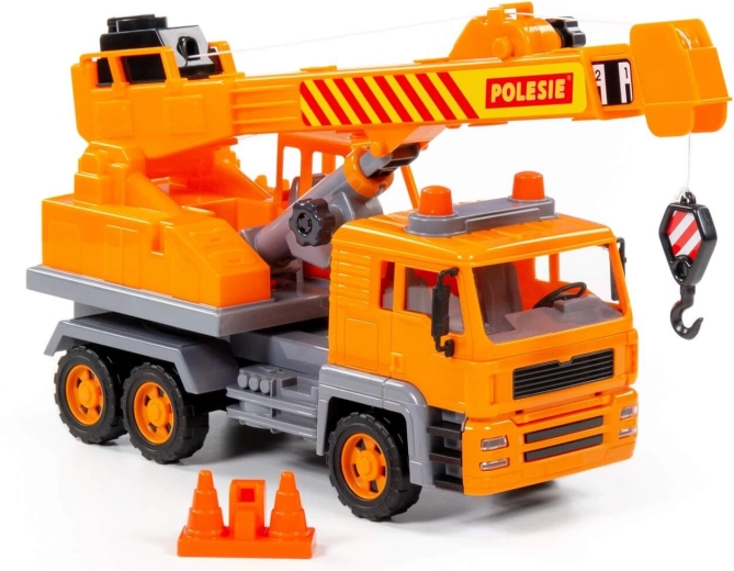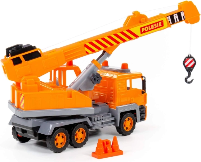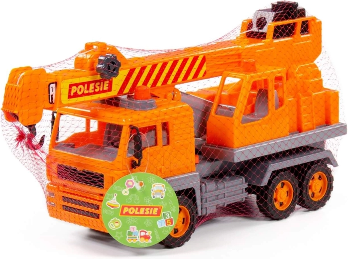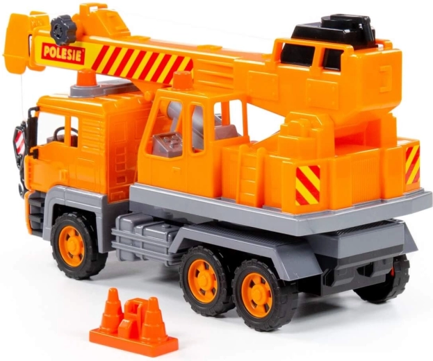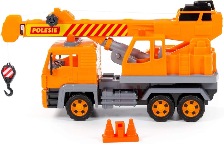 Seria de utilaje speciale „Diamant” cu mecanism pe volantă de la producătorul Polesie include principalele tipuri de autovehicule folosite în viața reală pentru diverse lucrări. Mașinile au un aspect realist cu atenție la detalii: există imitații de faruri, lumini intermitente și trei perechi de roți pe axe metalice. Autocranul este echipat cu o platformă rotativă și un braț extensibil cu cârlig suspendat. Cârligul poate fi ridicat și coborât cu ajutorul unui mecanism manual. Jucăria include, de asemenea, conuri de construcție care fac jocul mai interesant și complet.