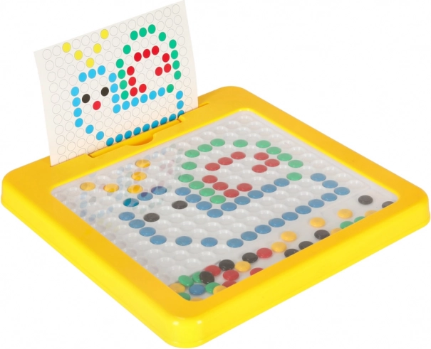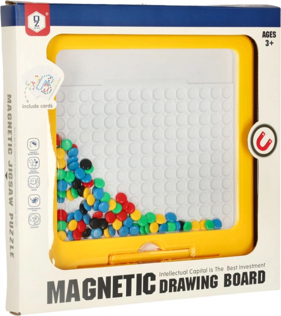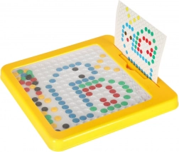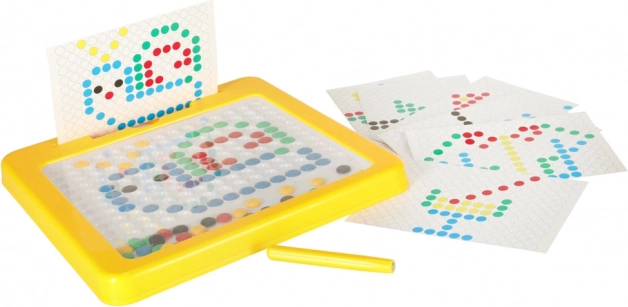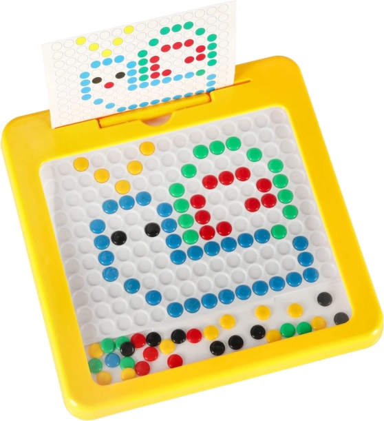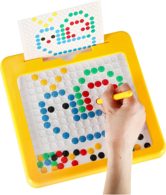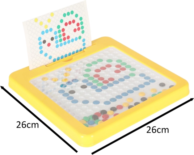 Tabla de desen magnetică cu mozaic este un excelent material didactic inspirat de principiile Montessori. Cu ajutorul stiloului magnetic, copiii atrag și mută „butoanele” colorate din placă și compun din ele motive simple și mai complexe. Sunt incluse carduri-model care ușurează începuturile și oferă inspirație.