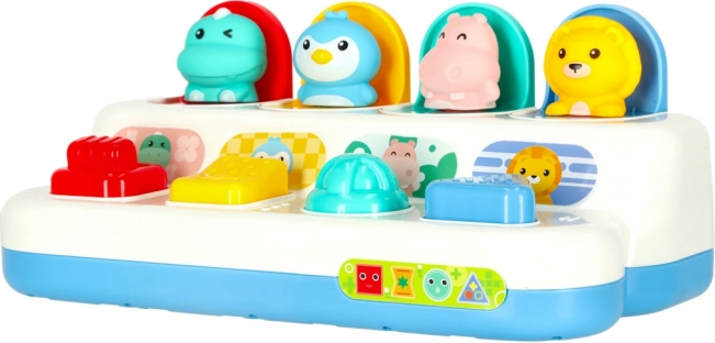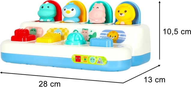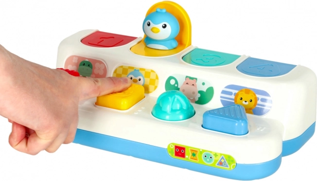 Această jucărie interactivă pop‑up îmbină învățarea cu jocul. Copiii descoperă culori, forme și numere, exersând în același timp concentrarea și gândirea logică. Fiecare panou are un mecanism diferit – apăsare, glisare sau rotire – iar după acțiunea corectă sare un animăluț simpatic. „Click‑ul” caracteristic susține percepția auditivă.